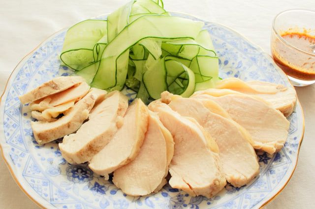 粗熱が取れた鶏肉を食べやすい薄さに切り、きゅうりと一緒に盛り付け、たれを添えたら完成です。