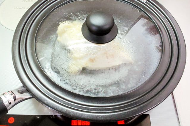 加熱中は何もすることがなく、フライパンの中の様子を観察していましたが、内部の水分は蒸発することなく、蒸気が満ちた状態で加熱し終えました。
