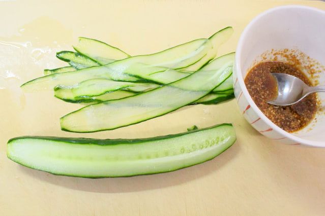 付け合わせのきゅうりはピーラーで薄切りにします。たれは調味料を合わせるだけなので簡単。