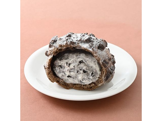 ザクザクしたココアクッキー生地をのせたシュー生地に、ビスケットクランチ入りのバニラクリームを入れたクッキー&クリームシューです。
