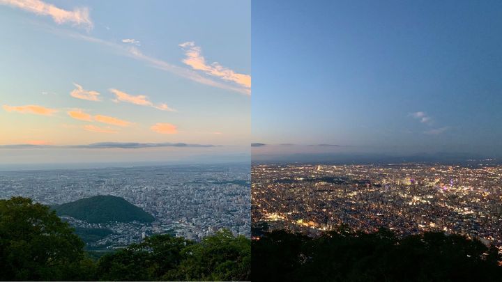 「次の便まで待つのがいいですよ」と案内を受けたものの、「もしかしたら間に合うのでは……?」と、バス停まで力の限り走りました。なんとか先発のバスに間に合い、無事展望台へ到着。澄んだ空に、大きく広がる札幌の街。夕方から夜へと移ろう札幌の景色を、山頂から存分に眺めることができました。