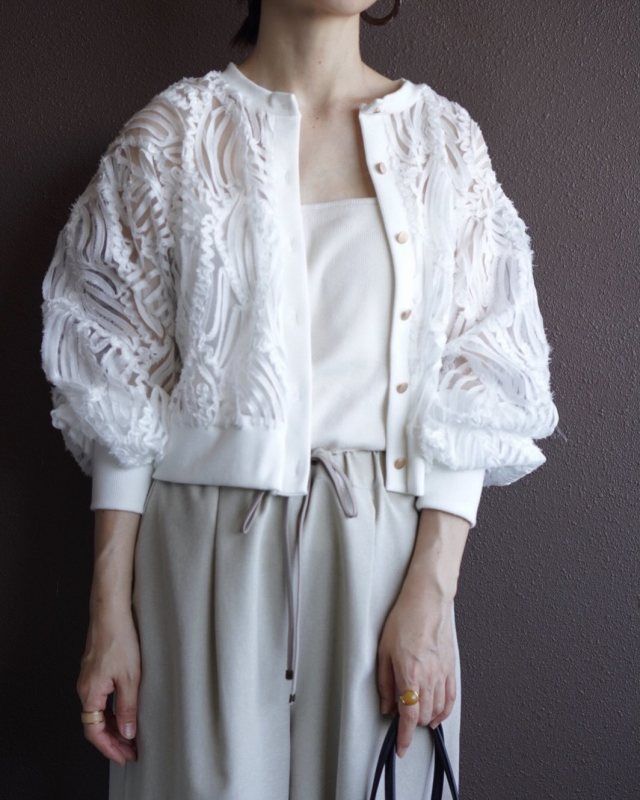 スナップで着用しているレースカーディガンのブランドは>>sakishimatokyo(サキシマトーキョー)