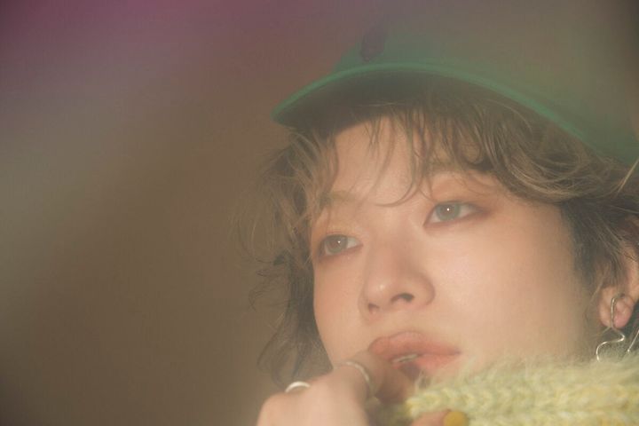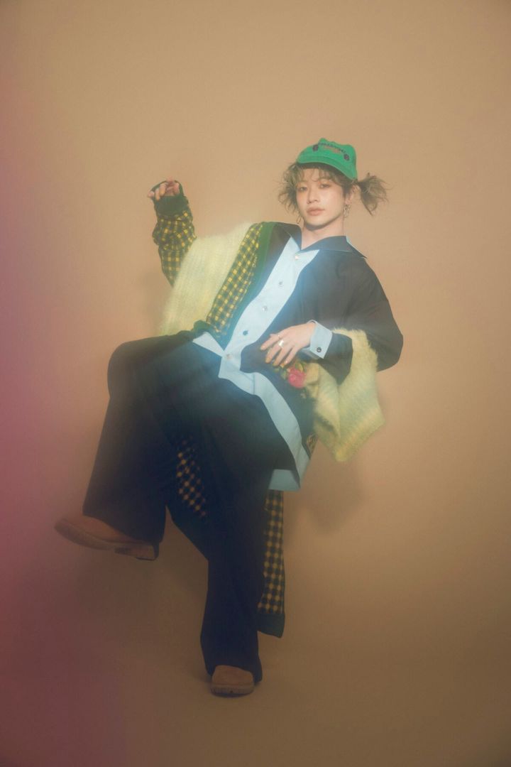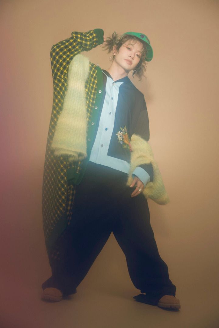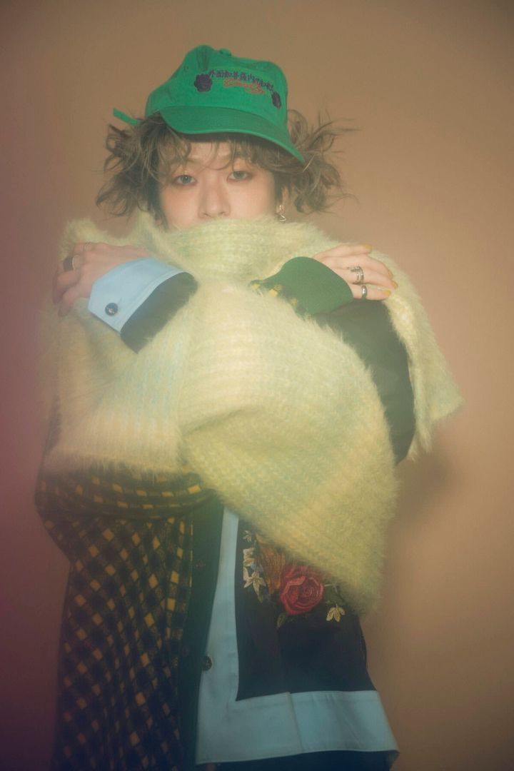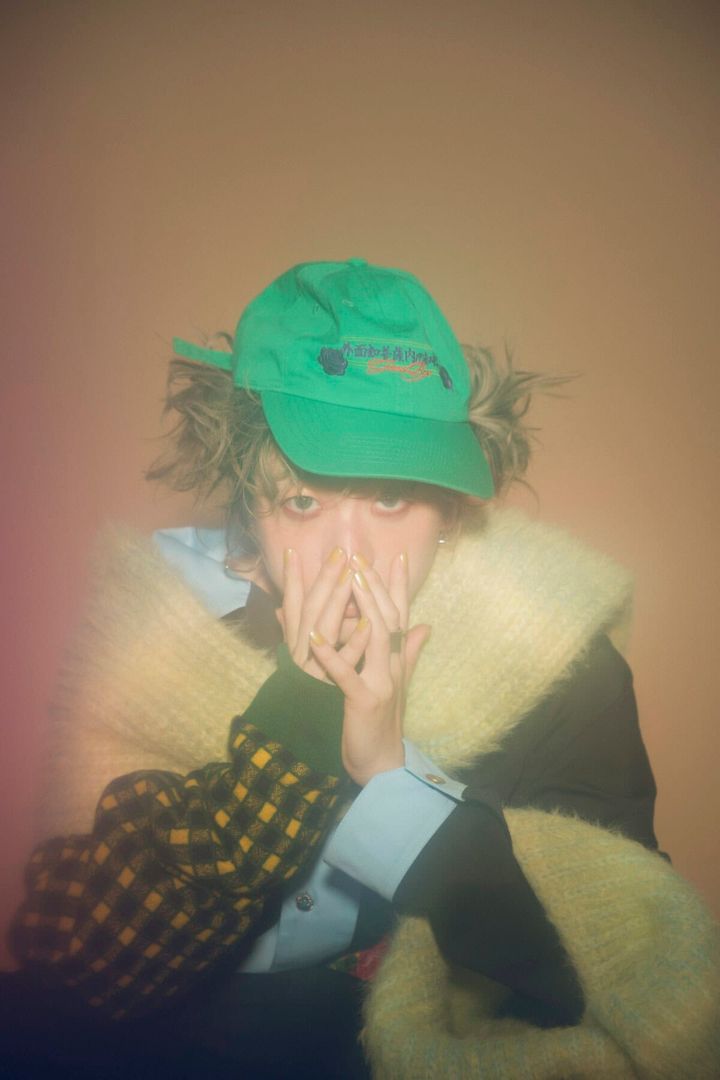 カーディガン¥53,000、シャツ¥69,000、パンツ¥64,000、キャップ¥10,000(全てTENDER PARSON)、 マフラーにしたニット¥7,150(VACANCY/アンティローザ)、右手薬指リング¥36,300、左手薬指リング¥165,000(シンゴクズノ/シアンPR)、ピアス¥35,200、右手小指リング¥25,300、左手中指リング¥42,900(PLUIE/PLUIE Tokyo) 、シューズ¥30,800(ティンバーランド/VF ジャパン)