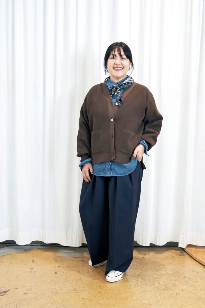 【日曜日】 デニムシャツをワイドパンツとニットカーデできれいめマニッシュ