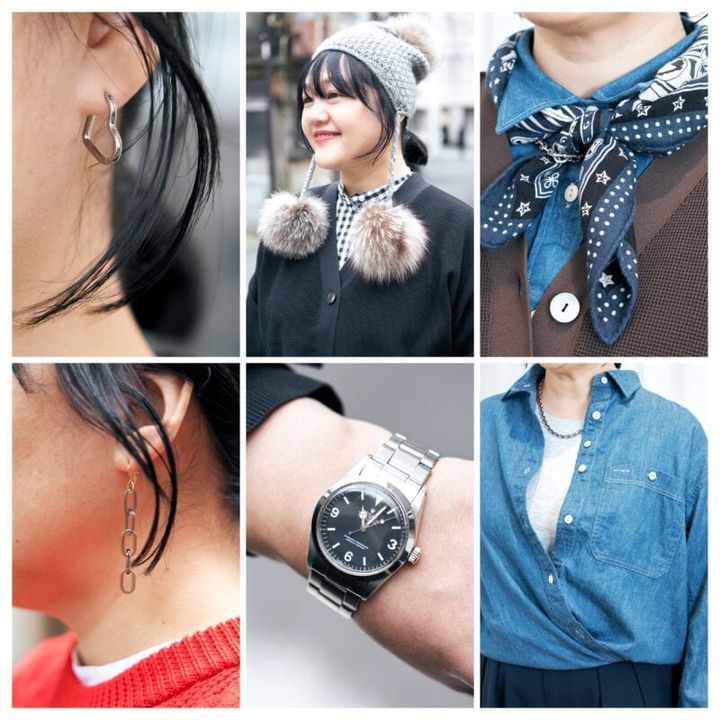 ピアスやネックレスはシルバーが中心で、カジュアルな装いにもぴったり。大阪で離れて暮らす夫から手渡されたメンズのロレックス(下段中)と、メンズのエルメスのスカーフ(上段右)など。メンズアイテムもコーデのアクセントに。冬らしいカシミア帽もメンズライクなコートに似合います。