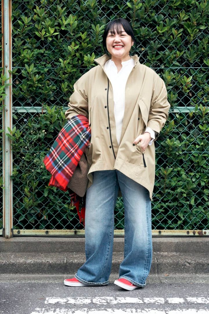 白ニット×ヴィンテージデニムにスポーティなモッズコートを合わせました。「カフェでまったり過ごすときは、こういうスタイルですね」と森さん。大判ストールとスニーカーで赤を差し色にして、ポップに!