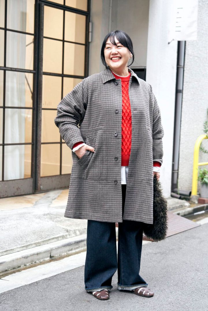 ベーシックなコートはトレンドのチェックを選ぶと旬度アップ。赤セーターをインに差し色にして。「セーターはウールに見えますが、実はポリエステル。それでいて肌ざわりはとてもいいんです」(森さん)。洗濯機で洗えるのも◎。