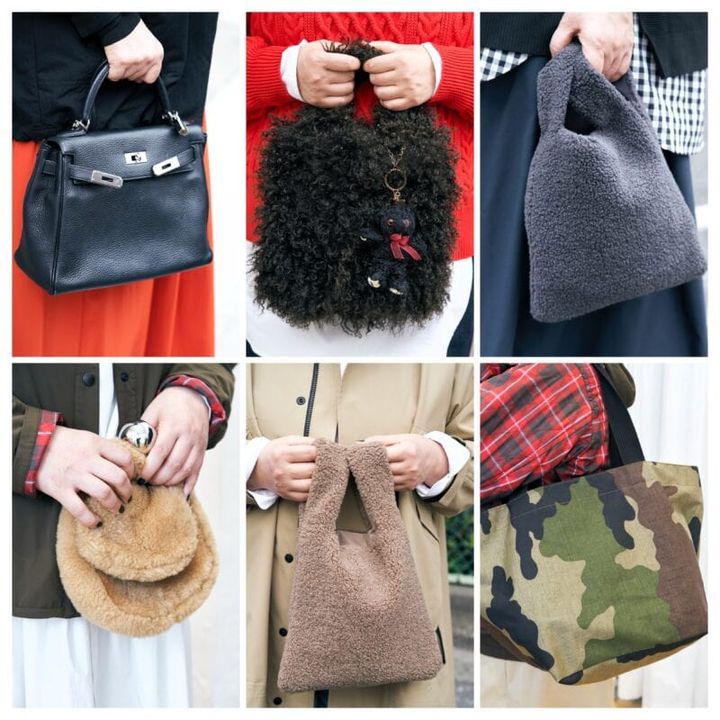 中高生のころにヴィンテージショップで買ったラムファーのバッグ(上段中)もあれば、エルメスのケリーバッグ(上段左)も。「エコファーやリアルファーのバッグは冬の楽しみ。エルメスのケリーバッグは、家族のセレモニーや大切な商談の日に持ちます」と森さん。