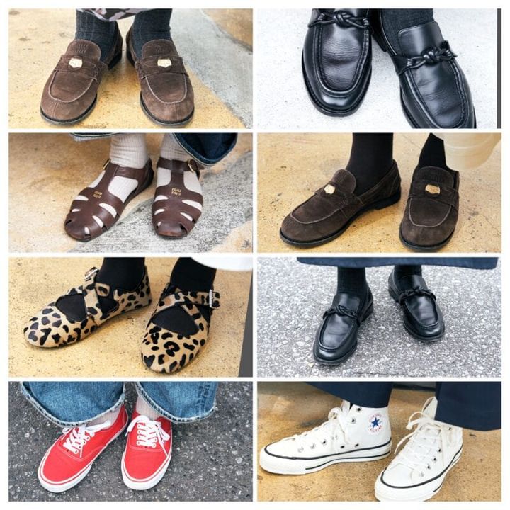 森さんの足元のおしゃれは、ミュウミュウ(上段右)やボッテガ・ヴェネタ(中段右)のローファー、アライアのヘアカーフのバレエシューズ(中段左)など、最旬のアイテムが揃います。週末のカジュアルなパンツスタイルには、ヴァンズ(下段左)やコンバース(下段右)のスニーカーをチョイス。