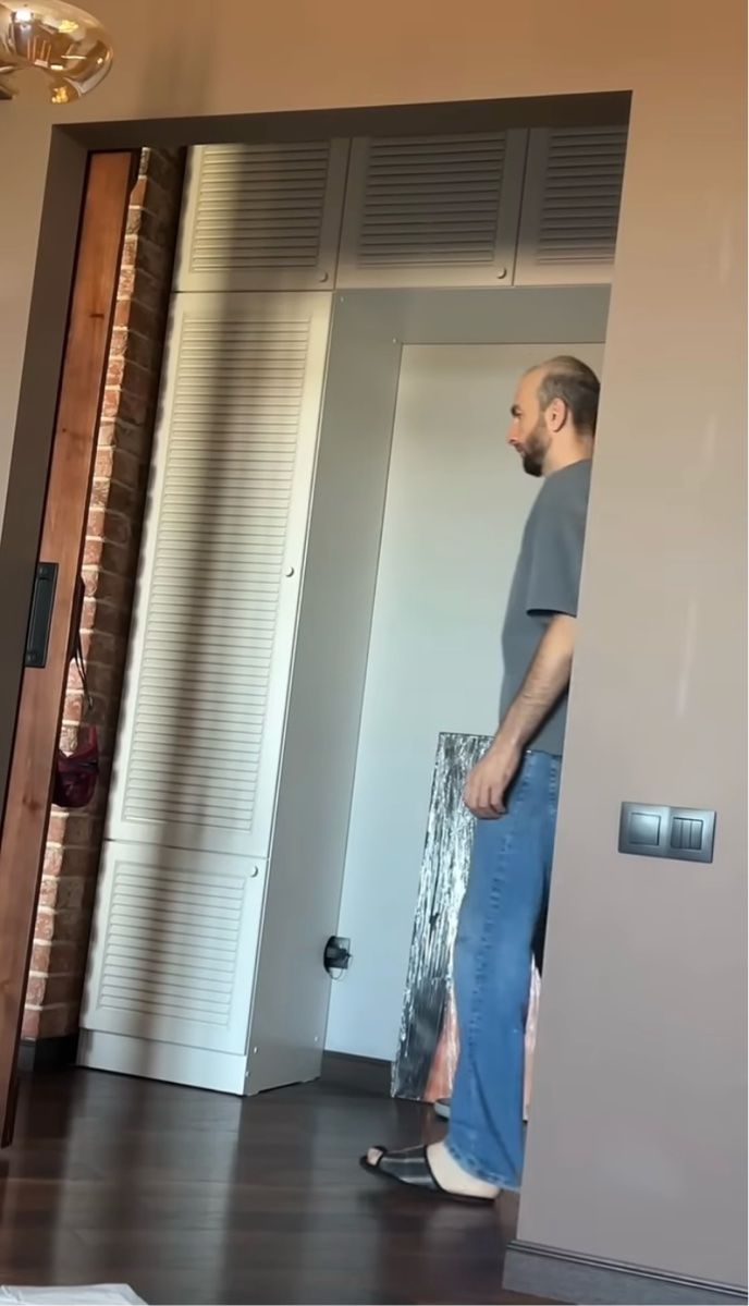 男性がカメラの前を横切ろうとしています。 しかし、歩き方に少しぎこちなさがあります。
