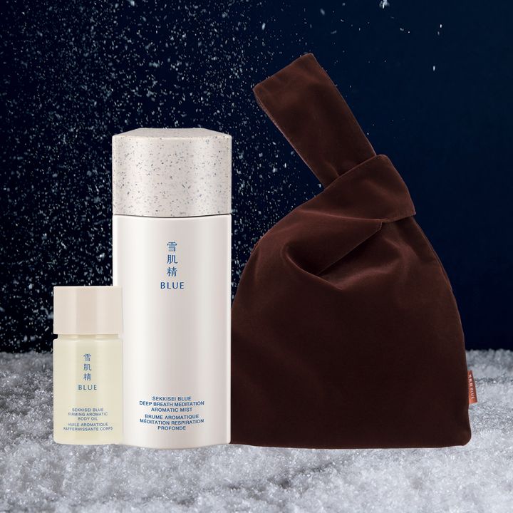 「雪肌精 BLUE ディープブレス メディテーション アロマ ミスト」の現品に「同 ファーミング アロマ ボディ オイル」のミニサイズとオリジナルバッグがセットされたキット。ミストはどんなシーンでも心地よく使える、スパイシーハーバルウッディの香り。和漢植物を配合したオイルはふっくらハリ肌に。雪肌精 BLUE ディープブレス メディテーション アロマ ミスト リミテッドキット ¥5,500〈編集部調べ〉(コーセー)