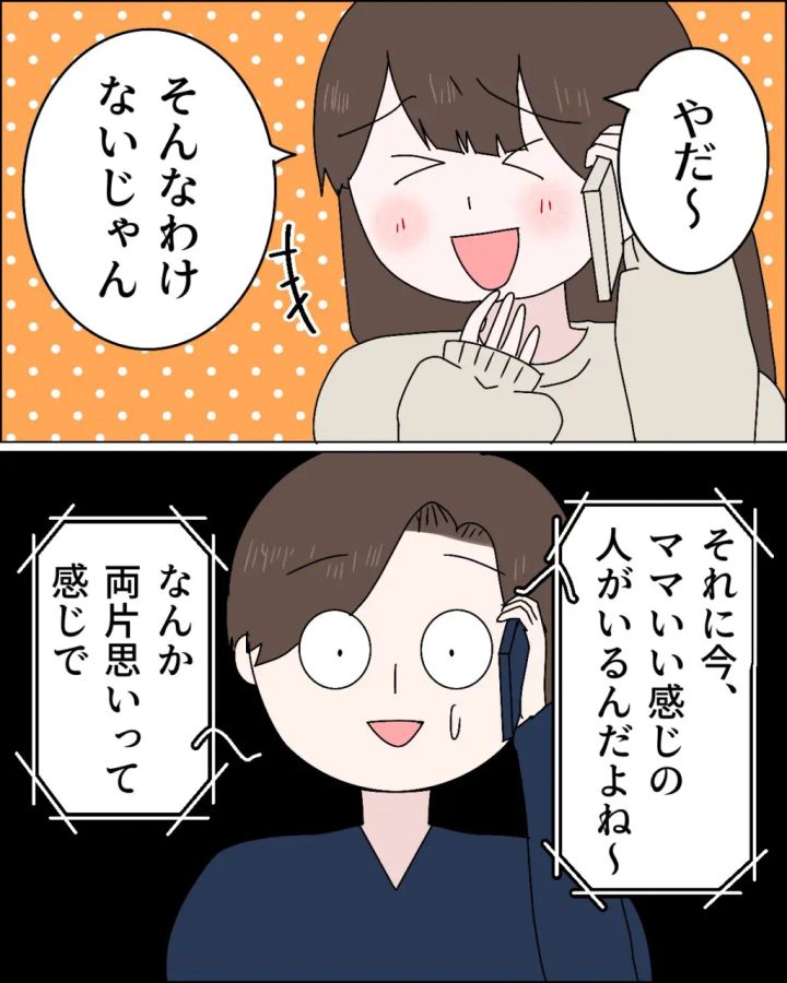 それを聞いたジュリちゃんは「やだ~!そんなわけないじゃん」と笑い飛ばし、「それに今、ママいい感じの人がいるんだよね~。なんか、両片思いって感じで」と楽しそうに話します。実は、その男性はリナさんの幼馴染なのです。リナさんが実家に離婚の報告をした際、リナさんの母親がその幼馴染の母に事情を話したことがきっかけで、リナさんは彼の会社で働くことになったのですが、ジュリちゃんは、その経緯を父に伝えるつもりはありません。
