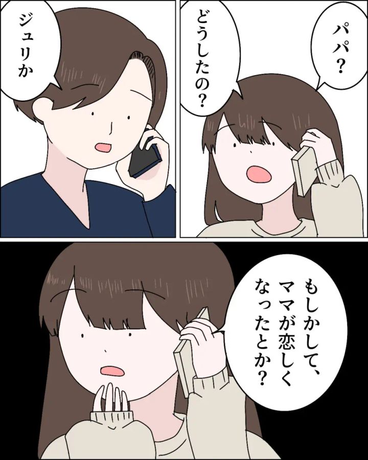 「パパ?どうしたの?」とジュリちゃんが電話に出ると、「ジュリか」と少し驚いた様子のケイさん。ジュリちゃんは「もしかして、ママが恋しくなったとか?」と聞きました。