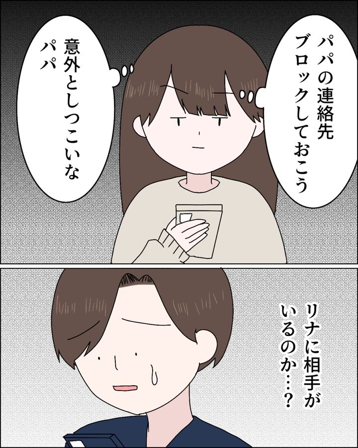 電話を切ったジュリちゃんは、「パパの連絡先ブロックしておこう。意外としつこいな、パパ」と考えながらリナさんのスマホでケイさんの連絡先をブロックしました。ケイさんは「リナに相手がいるのか・・?」とショックを受けていました。