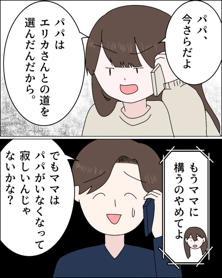 「パパ、今さらだよ。パパはエリカさんとの道を選んだんだから。もうママに構うのやめてよ」とケイさんに厳しい口調で言いました。すると、ケイさんは「でも、ママはパパがいなくなって寂しいんじゃないかな?」とリナさんと話したい素振りをみせます。