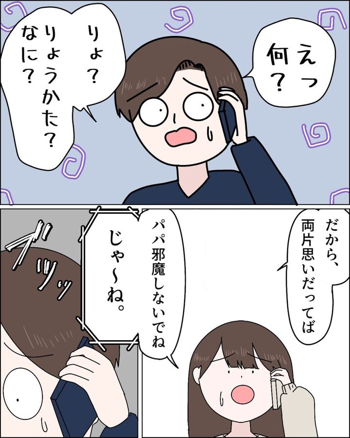 リナさんにいい感じの人がいると聞いて「えっ、何?りょ?りょうかた?なに?」と動揺を隠せないケイさん。ジュリちゃんは「だから、両片思いだってば。パパ邪魔しないでね。じゃ~ね」と言ってさっさと電話を切りました。
