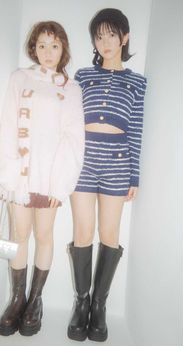 野口衣織、大谷映美里(=LOVE)。ar11月号より [野口]ニット¥7,990 /ジェイダ ルミネエスト新宿店 ベルト付きスカート¥7,920/アクレント ブーツ¥25,300/ル タロン(ル タロン 有楽町マルイ店) [大谷]ニット¥9,790/カルナムール スカート¥7,920/エモダ、ローファー¥19,580/ベクム(エモダ ルミネエスト新宿店) バッグ¥16,500/ダイアナ(ダイアナ 銀座本店) ソックス¥1,210/靴下屋(タビオ)
