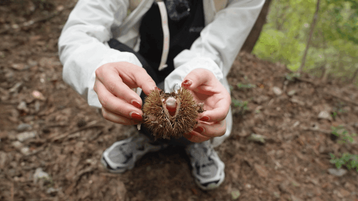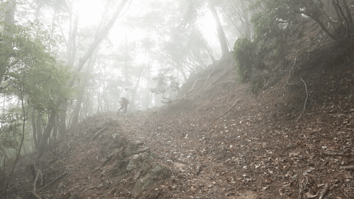 登山道はよく整備されていて多少の雨なら問題なく歩くことができます。すぐ横を流れる川から上がってきたサワガニと戯れてみたり、地面一面に落ちた栗にテンションが上がったり、今どきの山ガールって、こんなノリなのかな?アップダウンの少ない常に登り勾配の山道を快調に歩き続ける福田さん。いつしか雨足は弱まり、代わりに周囲は霧に包まれ始めました。晴天の日には見ることのできない幻想的な光景に更にテンションは上がります。