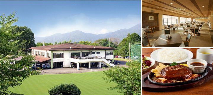 クラブハウスは昔ながらのシンプルな造り。レストランの人気メニューのひとつ、粗挽きハンバーグ(PGMオリジナルメニュー)。