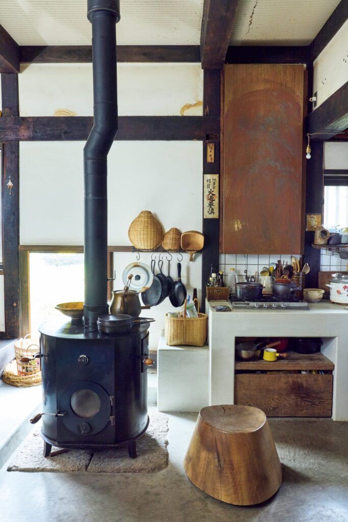 台所と居間を繋ぐスペースには、長野県中川村在住のイエルカ・ワイン制作の大きな薪ストーブが。冬になると、ピザやグラタンなどストーブオーブンを使った料理を楽しむ。