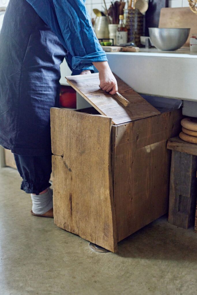 古材で誂えたゴミ箱(キャスター付き)はシンク下にぴったり収まる。