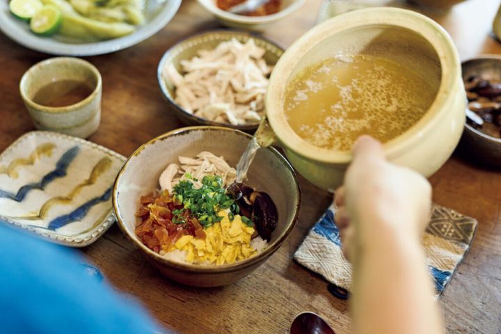今日のお昼は鶏飯。友人にごちそうになって以来、佳子さんのレパートリーに加わった。ご飯に鶏、錦糸卵、椎茸の含め煮、奈良漬などをのせて鶏だしをかける。