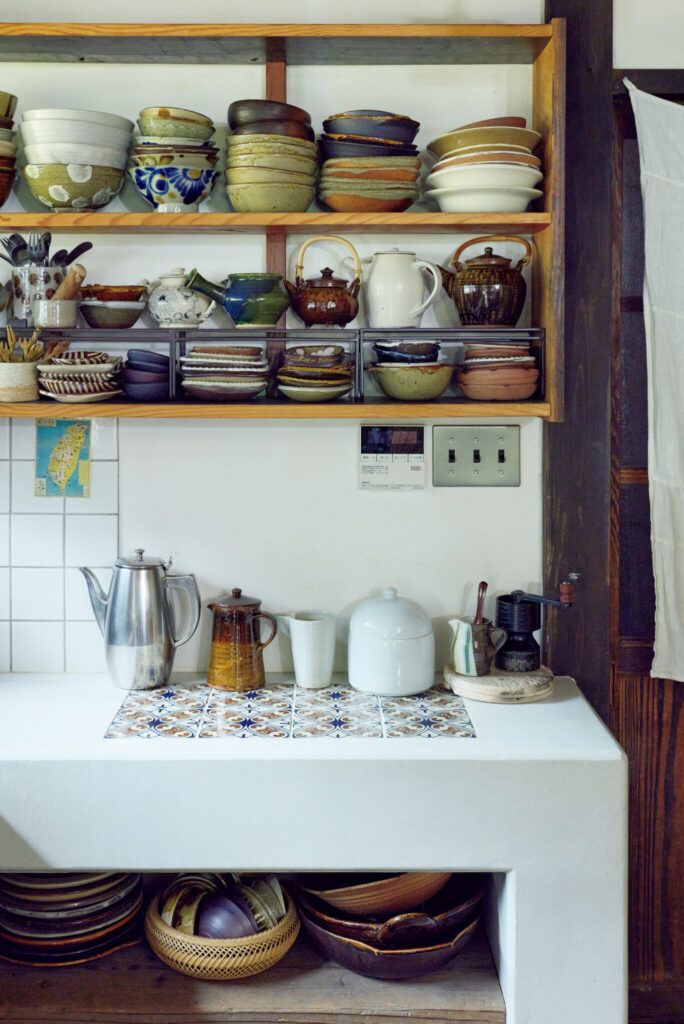 鳥取〈クラフト館 岩井窯〉の山本教行ら親交の深い窯元、作家の器が棚に並ぶ。モルタルの台には、〈瀬戸本業窯〉を訪ねた際に譲り受けた古い吉祥模様のタイルを埋め込んだ。ステンレスポットの隣は齊藤十郎のポット。「十郎さんからもらったミルをきっかけにハンドドリップが好きになりました」