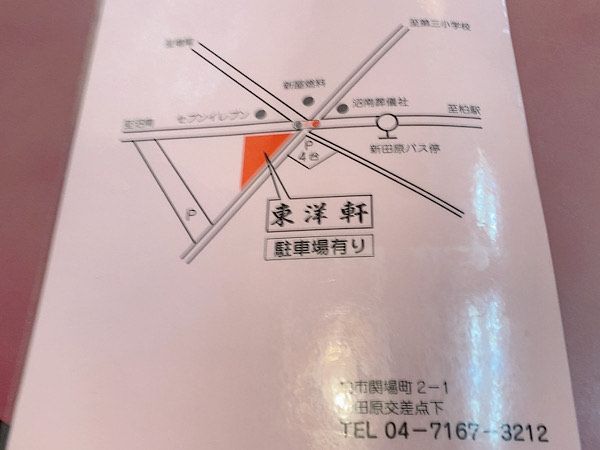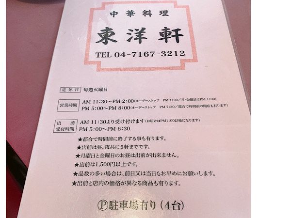 [中華料理 東洋軒] □住所:〒277-0028 千葉県柏市関場町2-1 □電話番号:04-7167-3212 □営業時間:11時30分~14時00分、17時00分~20時00分 □定休日:火 □駐車場:あり 4台分