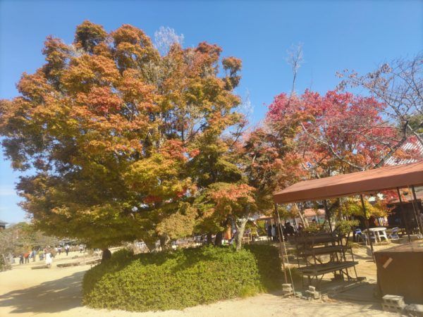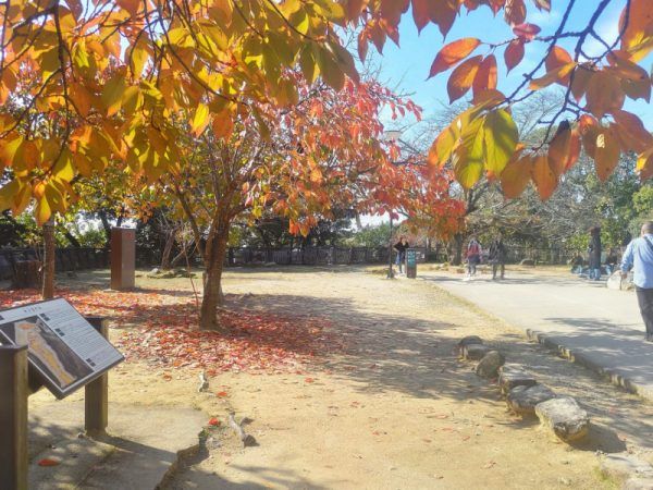 松山城は本丸、二之丸、三之丸(堀之内)の大きく3つのエリアに分けられます。天守閣があるのが本丸広場で、リフトやロープウェイで登るのが一般的ですが、歩いて登ることも可能です。本丸広場の紅葉は山頂だからか比較的早い印象で、特に日当たりの良い場所はすでに葉が枯れている木もありましたが、それでも十分綺麗でした。