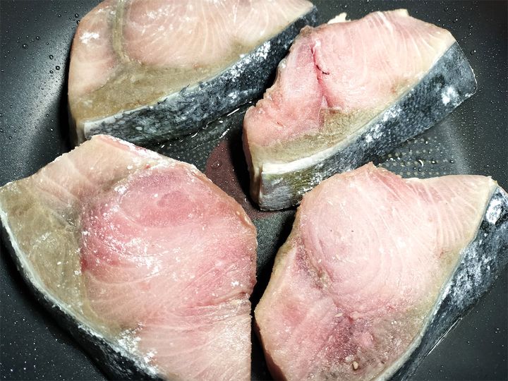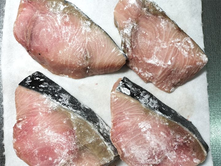 1. ブリに薄く薄力粉をまぶします。