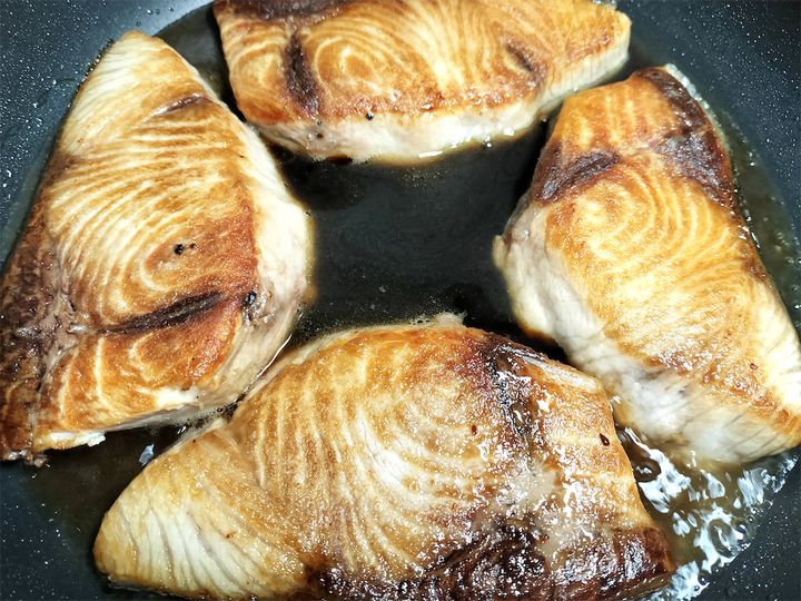 4. ブリの表面を下にしてフライパンに入れ、焼き目がしっかりつくまで焼きます。