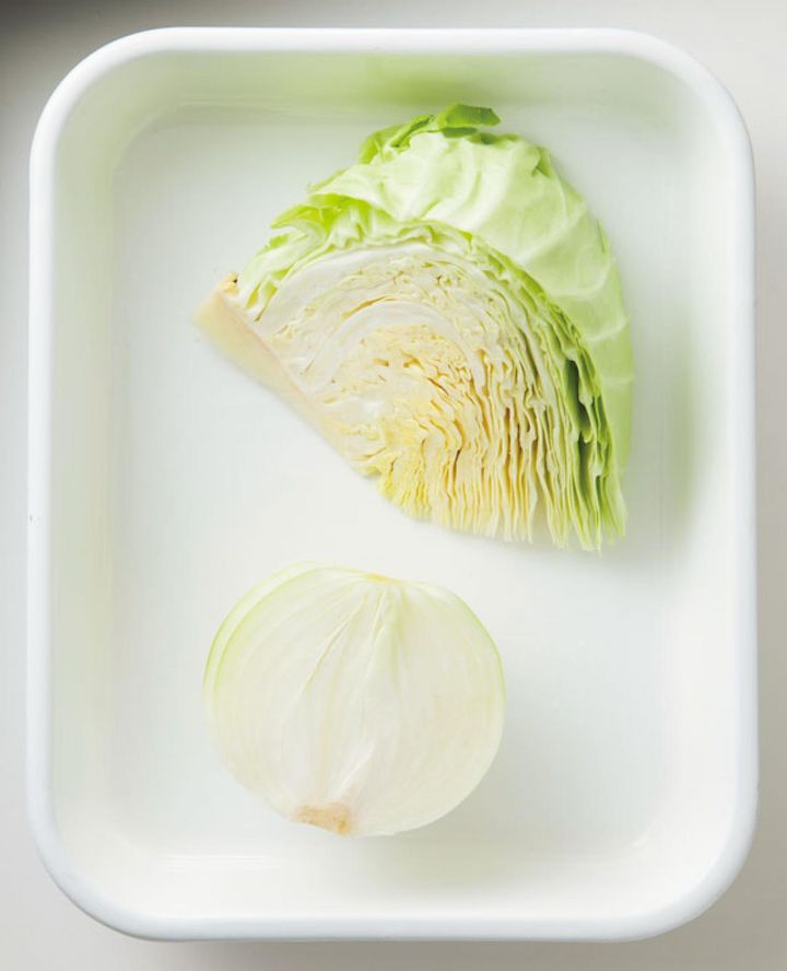 ①キャベツはざく切りにし、玉ねぎは薄切り(繊維に沿って)にする。