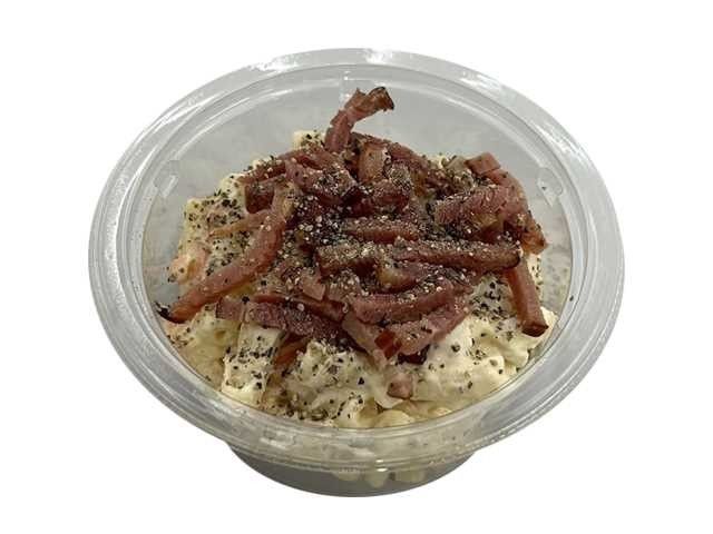 マカロニサラダにベーコンとブラックペッパーを組み合わせたおつまみにもなるサラダです。