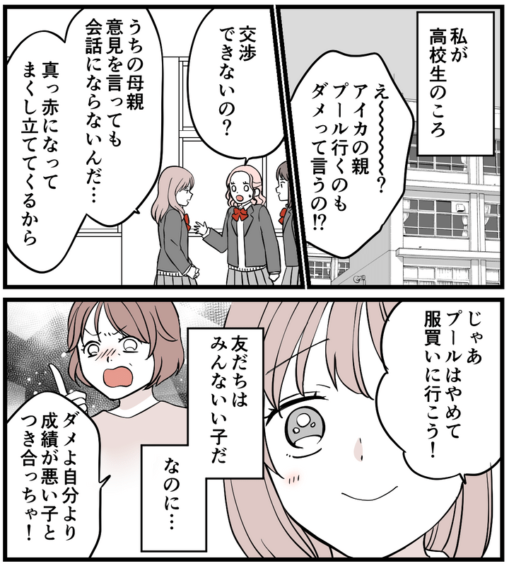 私はアイカ。昔から過干渉な母にうんざりしていました。そんな私も大人になり、結婚を前提に同棲することをヒロトとふたりで報告しに行きました。すると母は同棲に大反対。しかも反対するだけでなく、次々に非常識な要求を突きつけてきて、私たちは呆れてしまいました。父が慌ててなだめてくれたおかげで、どうにか同棲の許可は得ましたが……母の過干渉な態度には心底うんざり。母は私の交友関係にも口を出して、行動を制限していました。