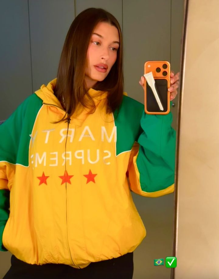 ヘイリーは、イエローのウィンドブレーカーを着たミラーセルフィーを投稿。グリーンのアクセントとオレンジのスターがあしらわれ、胸元には映画タイトルのシルバー文字が輝く。手にしたスマホケースには、自身のブランドのロード(RHODE)のリップグロスが映り込み、抜群の統一感を演出していた。
