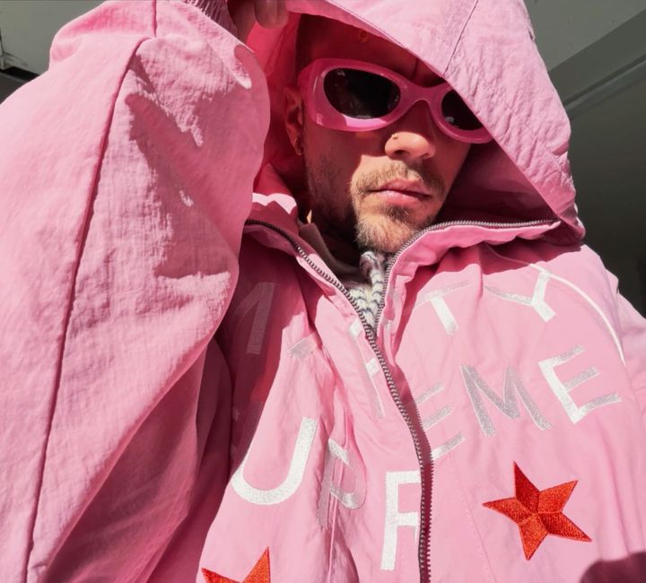 一方ジャスティンは、ピンクのウィンドブレーカーをチョイス。オレンジの星とシルバーのロゴはそのままに、自身のブランド、スカイラーク(SKYLRK)のバブルガムピンクのサングラスと完璧にマッチしていた。