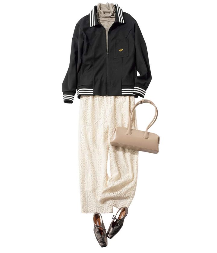 ブルゾン¥16,500〈アディダス オリジナルス フォー ビューティー&ユース〉タートルトップス¥8,910 レースパンツ¥18,920〈ともにビューティー&ユース〉(すべてビューティー&ユース ユナイテッドアローズ 丸の内店)リング¥110,000 ピアス¥35,970(ともにプリーク/エイチ ビューティー&ユース )バッグ¥48,400(オソイ フォー ユナイテッドアローズ/OSOI SHINJUKU )シューズ・コンビリング(ともにスタイリスト私物)
