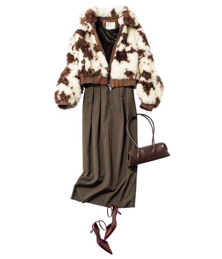 フワモコで丈感が今っぽいアニマル柄ファーコートに深みレッドの靴やアクセで洒落感をプラス。アウターや小物にインパクトがあるので、インナー&スカートはアースカラーで統一してシックに。女子ドライブで気分の上がるコーデに仕上げました。