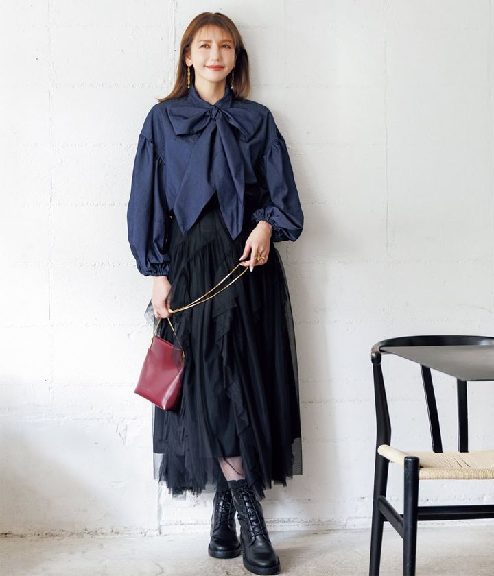 ボリューム袖&ビッグリボンのブラウスもデニム素材が甘さを抑えて気取らないスタイルに。華やかなチュールスカートを合わせた“ほぼ黒”コーデならこれから増えるイベントシーンも余裕で対応可能。ボルドーをひと差しすればシーズンムードも高まります。