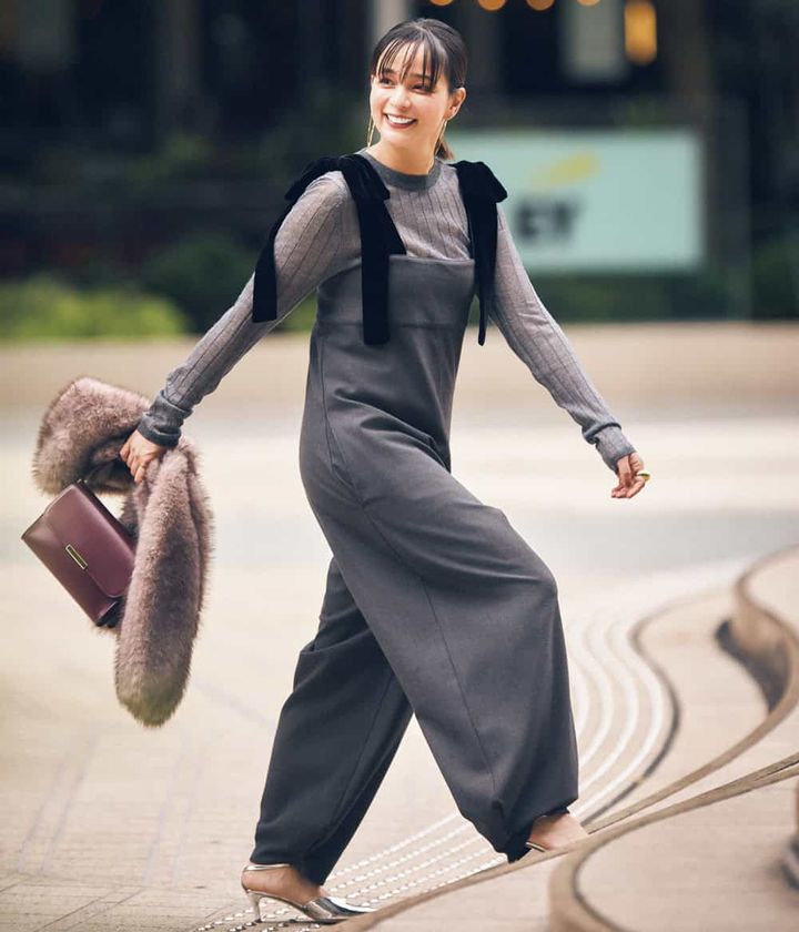 オールインワン¥36,000(シーニュ)ニット¥9,900(ノーク)バッグ¥16,500(アンタイトル)パンプス¥66,000(ネブローニ)ストール¥14,300(マルティニーク/マルティニーク ルミネ横浜)ピアス¥19,250(マユコ)リング¥24,200(ココシュニック オンキッチュ/ココシュニック)