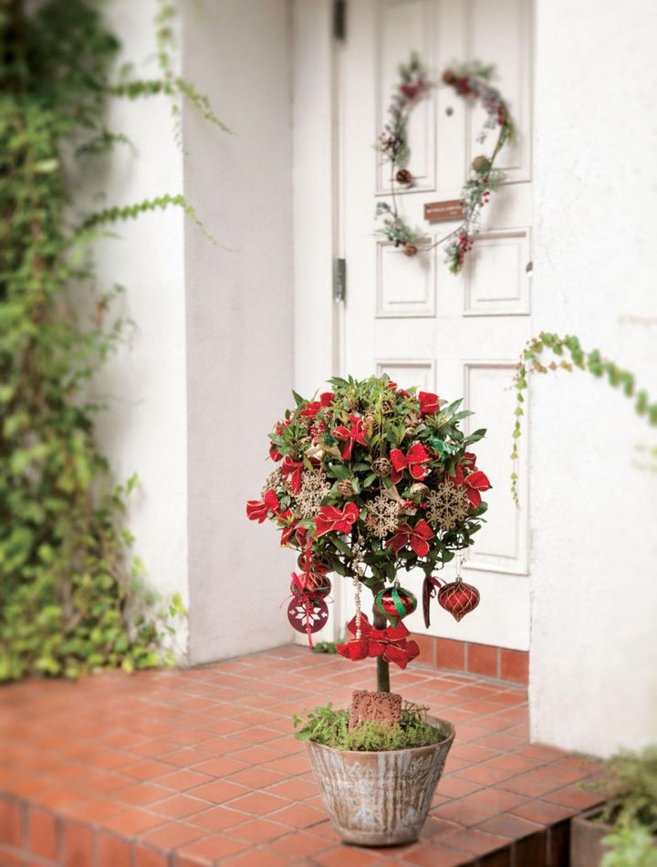 スタンダード仕立ての樹高70cmほどのゲッケイジュを、赤のリボンとゴールドのオーナメントでたっぷり、華やかに飾りました。株元はクリーピングタイムなどで土を隠し、お気に入りのレリーフも添えて。