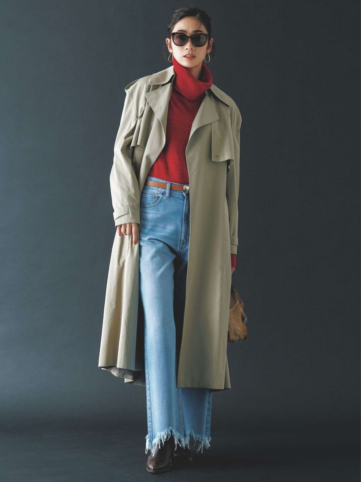 トレンチコート¥79,200(レハ/ユナイテッドアローズ 渋谷スクランブルスクエア店)ニット¥83,600(ラスパイユ/ザ エディット ストア)パンツ¥9,900(Mila Owen/Mila Owen ルミネ新宿2店)バッグ¥64,900(ジャンニ キアリーニ/ジャンニ キアリーニ 銀座店)ブーツ¥26,400(ダイアナ/ダイアナ 銀座本店)サングラス¥49,500(プロポ/プロポデザイン)ピアス¥55,000(リューク)ベルト¥12,100(レフィエ/フラッパーズ)
