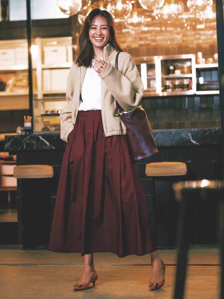 寒さを感じやすくなってきた気温には、肌触りの良いフリースブルゾンをチョイス。外に出たら前を閉めれば、しっかり防寒。ショートすぎない着丈が着回しやすさ抜群。可愛げアウターは、大人色スカートで落ち着きを。