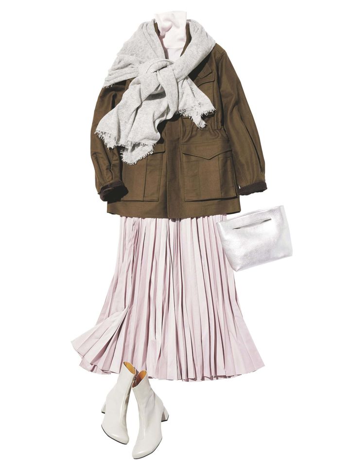 ミリタリージャケット¥89,100(カオス/カオス丸の内)ニット¥26,400(エイトン/エイトン青山)スカート¥27,940(23区/オンワード樫山)ストール¥60,500(アルポ/アマン)バッグ¥64,900(MIUUR/ショールーム セッション)ブーツ¥80,300(カチム)