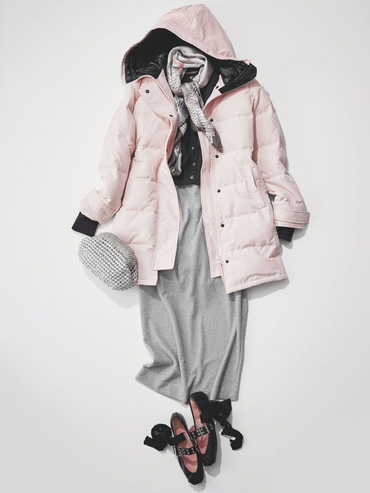 ピンクダウンコート¥242,000(カナダグース/カナダグースジャパン)ニット¥57,200(LOWER/ショールーム セッション)ラメスカート¥15,950(ジネス/ジオン商事)スカーフ¥22,000(マニプリ)バッグ¥55,000(ノアム ハザン/ティースクエア プレスルーム)シューズ¥60,500(プリティ・バレリーナ/F.E.N.)