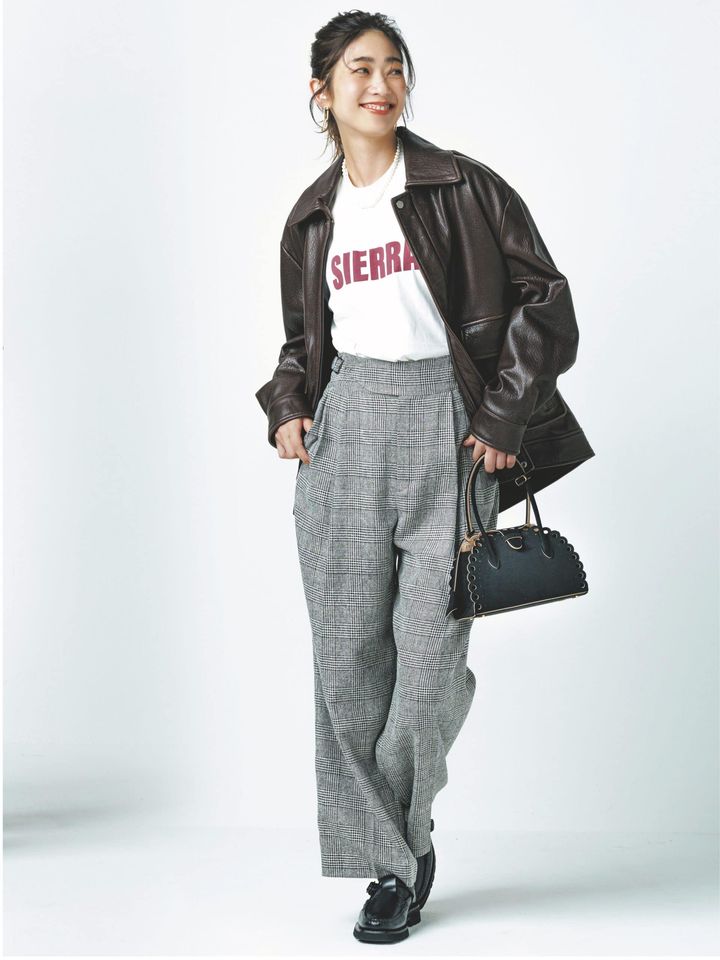 風を通しにくいレザーが、「日は出ていても寒い」や「自転車の風通り抜け」問題を解消!ゆるっと着れるサイズ感は、前を開ければ体温調節もバッチリです。チェック柄パンツのあわせるとトレンド感MAXなスタイルに。