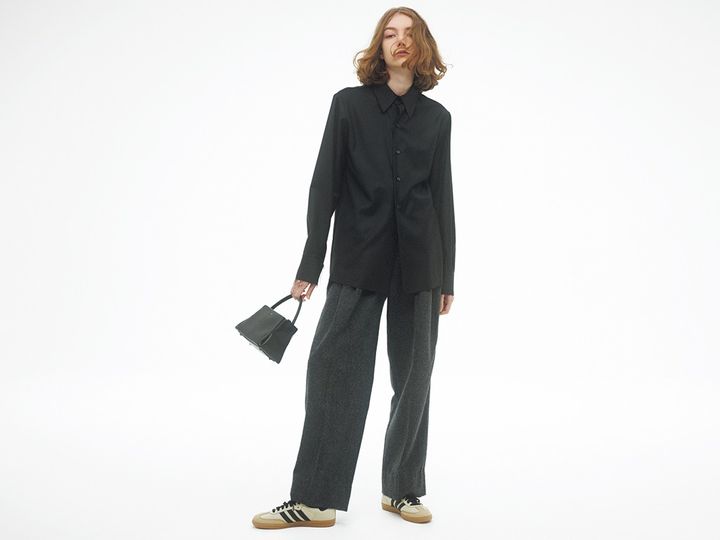 黒シャツ(別注)/GABRIELA COLL(ランド オブ トゥモロー) グレーパンツ/THE SHINZONE(Shinzone ルミネ新宿店) バッグ/Cambridge Satchel(エスピービー) スニーカー/adidas(アディダスお客様窓口)