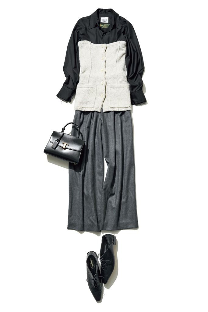 インナーに悩むアイテムこそ、黒の出番。とろみ素材だから、重ねたときももたつきはなし。黒と白のコントラストをなじませてくれる、グレーパンツの起用もポイント。