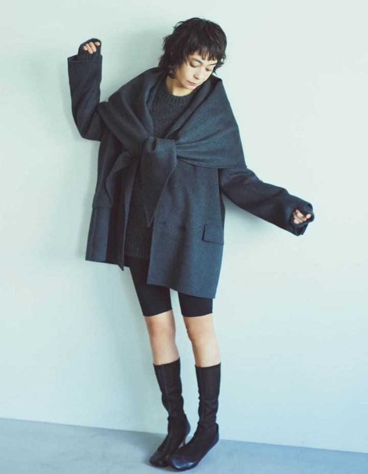 上質なウールを使用したリバー仕立てのコートは同素材のストールを巻いて今っぽくアレンジ。ボトムにはバイカーパンツを合わせてモダンに。グレーを使用したコーデはトーンONトーンでまとめるとグッと洒落感UP。