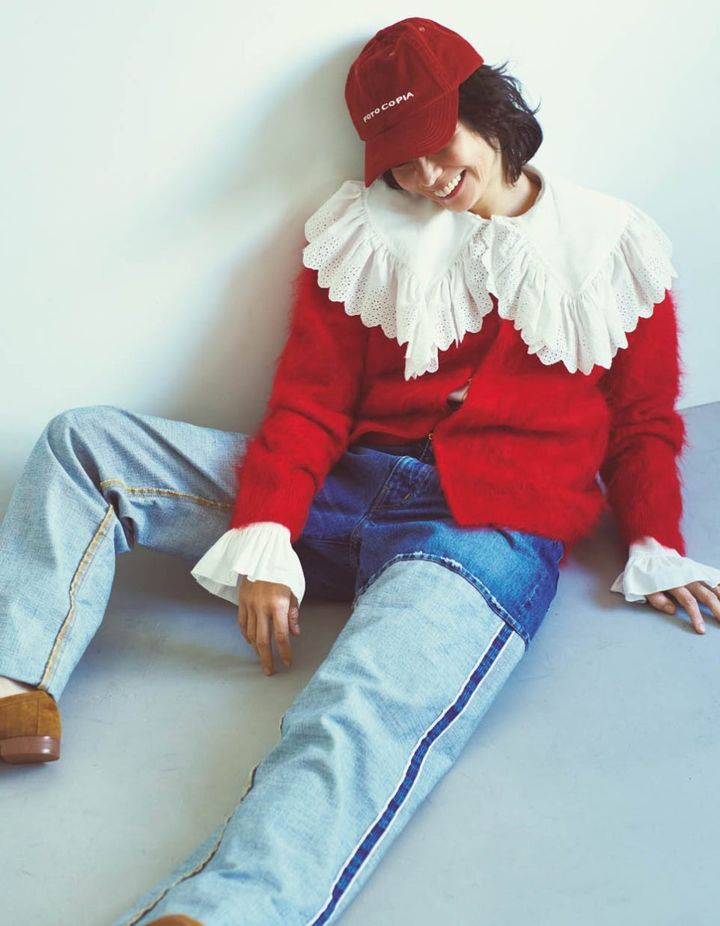 毛足の長い深紅のニットカーデにビッグカラーのブラウスを合わせて思いっきり甘く♡ ただし、デニムとキャップで全体のバランスUPもお忘れなく。